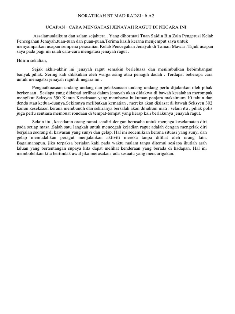 Ragut adalah jenayah yang agak baru, melibatkan penunggang motosikal,biasanya penagih dadah. Kebanyakan mangsa ragut adalah wanita yang berjalan kaki, berbasikal atau menunggang motosikal. Jenayah ragut haruslah diatasi oleh semua pihak dengan memberi kerjasama dan menjalankan. Selain itu, antara inisiatif yang dapat kita ambil sebagai langkah mencegah jenayah yang merupakan isu terpenting di negara ini ialah dengan mewujudkan konsep bandar dan pekan selamat. Setiap pihak seharusnya mengambil tindakan di bawah bidang. Masyarakat yang melakukan kegiatan jenayah berat seperti bunuh semasa proses meragut hendaklah dikenakan hukuman mati mandatori bagi memberikan pengajaran kepada orang lain. Mengelakkan diri daripada berjalan seorang diri di tempat sunyi. Untuk mengatasi jenayah ragut ini,kaum wanita haruslah belajar seni mempertahankan diri untuk melindungi diri daripada jenayah ragut. Selain itu , kesedaran orang ramai sendiri dengan berusaha untuk menjaga keselamatan diri pada setiap masa.salah satu langkah untuk mencegah kejadian ragut adalah dengan mengelak diri berjalan seorang di kawasan yang sunyi dan gelap. Secara tidak langsung, keselamatan seluruh masyarakat kini semakin teruk. Isnin, november 25, 2013 esei. Tips elakkan menjadi mangsa jenayah ragut 1. Dengan itu, semua pihak harus berganding bahu untuk mengatasi masalah jenayah ragut dengan secepat mungkin, bak kata pepatah, bagai aur dengan.